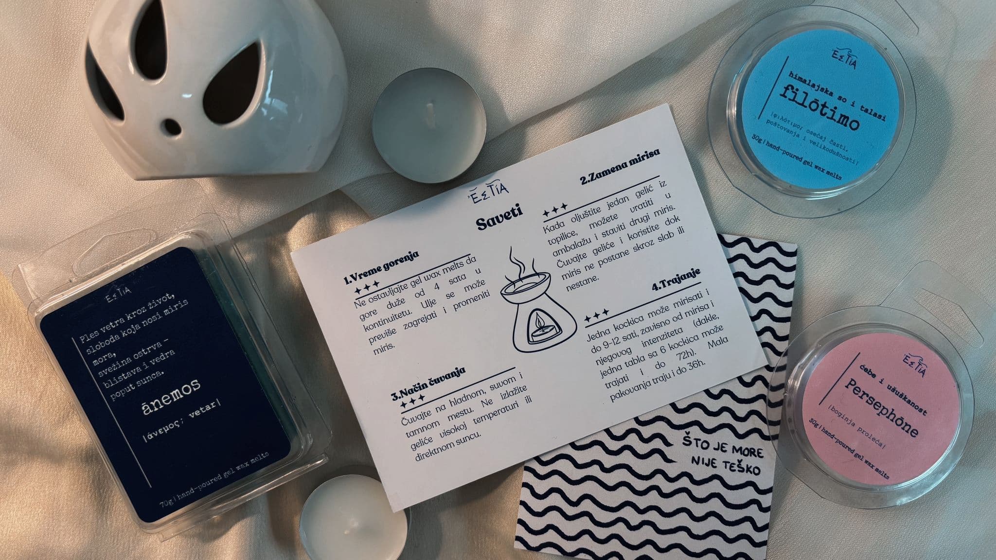 Naša priča počinje tamo gde se miris mora spaja sa svetlošću Egeja. Biramo mirise u Grčkoj i u našoj radionici pretvaramo ih u gel wax melts koji mirišu na more, sunce i male mediteranske trenutke.