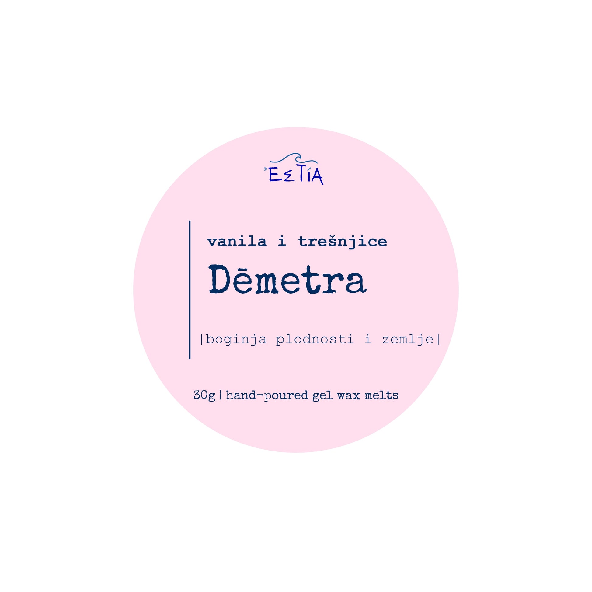 Poput boginje, zaštitnice plodnosti i žetve, "Demetra" unosi toplinu, radost i obilje u svaki prostor. Gornje note crvenog bobičastog voća donose osvežavajuću i energičnu svežinu, dok srce od intenzivne crne trešnje stvara bogat, sočan doživljaj. Baza od vanile sa primesama šećerne slatkoće ostavlja topao i sladak trag – savršen za prostore koji zrače udobnošću, harmonijom i životnom energijom.